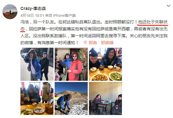 3月15日,馮浩在邦達(dá)錯(cuò)離隊(duì),選擇一個(gè)人橫穿無(wú)人區(qū)。4月17日,林夕和李志森走出無(wú)人區(qū),卻發(fā)現(xiàn)馮浩失聯(lián)。隨后李志森在微博發(fā)布馮浩失聯(lián)消息,并協(xié)助相關(guān)部門進(jìn)行救援。