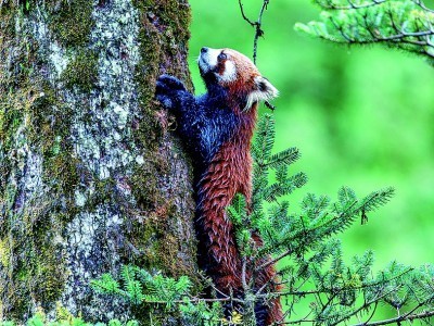 正在攀爬冷杉的小熊貓。本報記者 周夢爽攝