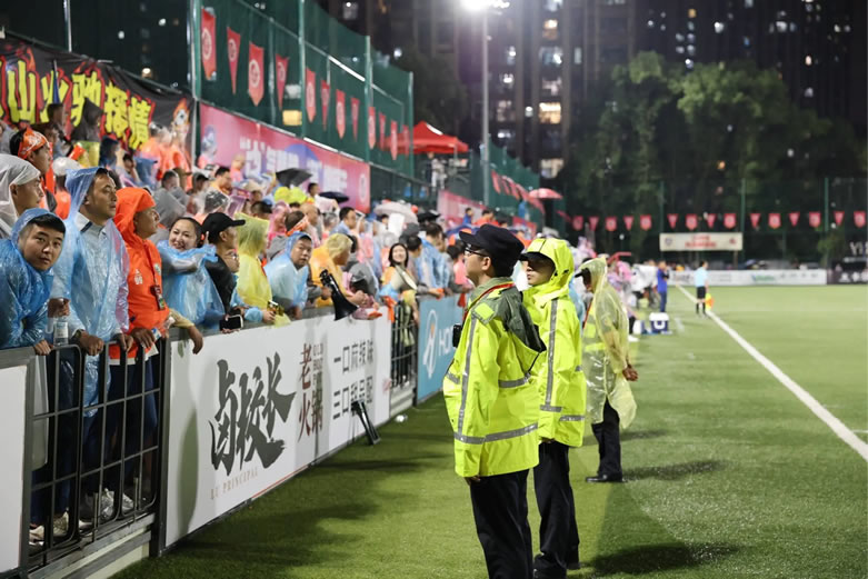 在此過程中,民警、輔警在嚴謹安保的同時,還用心提供便民服務。期間,他們耐心幫助小球迷穿好雨衣、協助群眾尋找遺失物品、攙扶行動不便者通過積水路段,用實際行動為賽場增添溫暖。