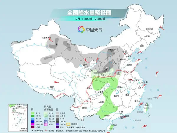 在這次寒潮過程中,由于水汽條件較好,我國將出現大范圍的雨雪天氣,這將是立冬以來最大規模的雨雪天氣。預計今起至13日,新疆、西北地區、華北、黃淮中北部、內蒙古中部及東北地區中南部等地有小到中雪或雨夾雪,部分地區有大雪,新增積雪深度2至8厘米,局地可達10至15厘米;四川盆地、江漢、黃淮南部及其以南地區有小到中雨,局地大雨。