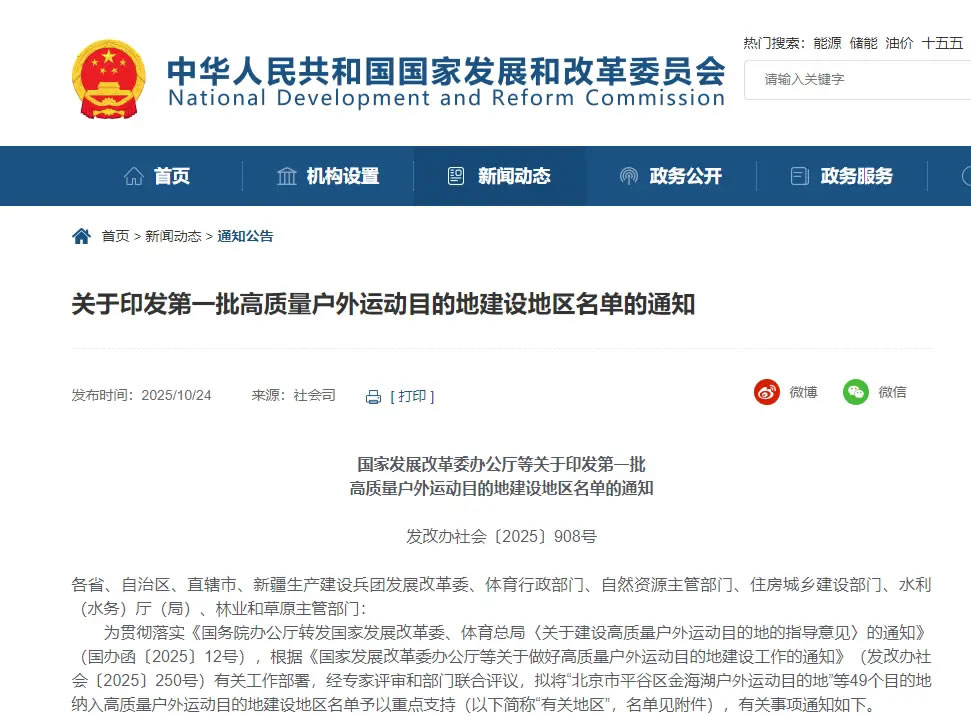 第一批高質量戶外運動目的地建設地區名單