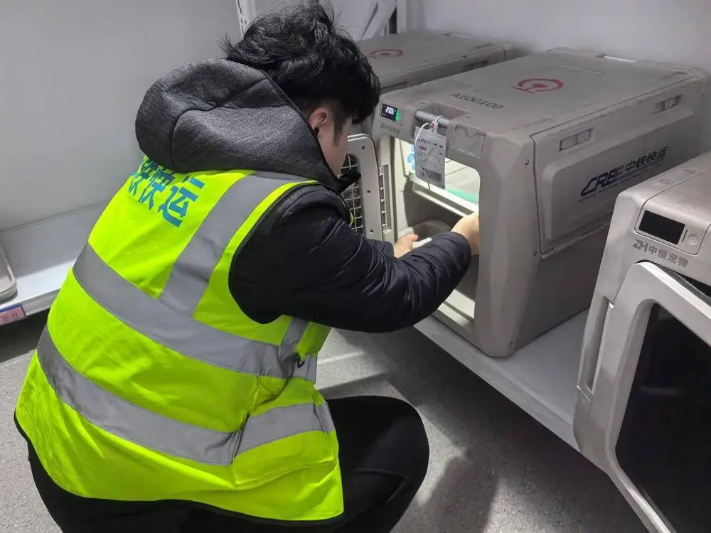 記者在采訪中看到,寵物被托運過程中,全程處于專用的運輸箱內。運輸箱放置在高鐵快運柜中,與旅客形成空間上的隔離。鐵路工作人員介紹,這種運輸箱自帶空氣循環系統,還帶有含氧量、溫度、濕度監測裝置以及除味裝置,既讓寵物享受到專業呵護,又能保障其他乘客的乘車體驗。