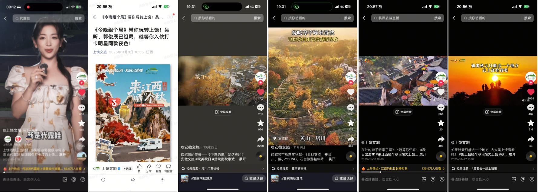 50余位跨界及垂類達人共同參與秋季種草內(nèi)容創(chuàng)作,整體曝光量突破千萬級別,覆蓋江西上饒、安徽黃山15家重點頭部商家,以多元化的內(nèi)容視角與持續(xù)的內(nèi)容輸出,形成從點到面的內(nèi)容爆發(fā)態(tài)勢,推動江西#婺源曬秋的味道藏不住了 、安徽#潛入徽州的秋日畫卷 等城市賞秋熱點上榜,讓江西與安徽兩地秋景,以更生動的方式呈現(xiàn)在用戶面前。